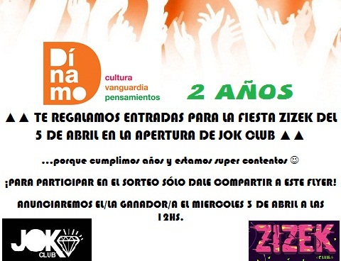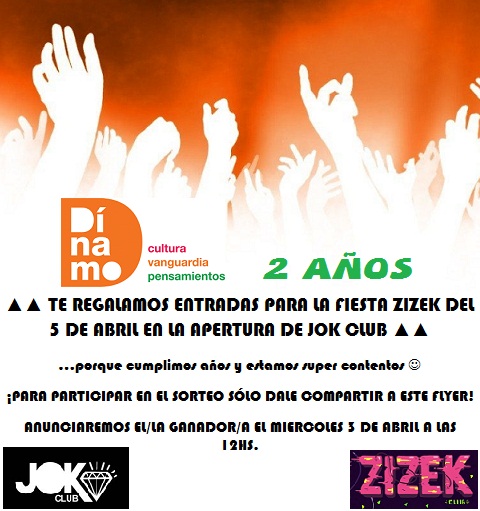 Para participar por un par de entradas para la alucinante fiesta de apertura, sólo tienen que ir a la Fan Page de Revista Dínamo en Facebook y compartir el flyer. El miércoles 3 de abril se anunciarán los ganadores.