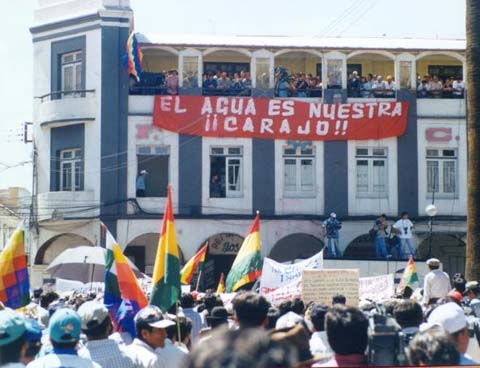 La Guerra del Agua ocurrió en Cochabamba en enero y febrero del año 2000. El conflicto en cuestión fue que el gobierno de Hugo Banzer había llamado a licitación a las empresas privadas para el suministro del agua potable. Aguas de Tunari, mayoritariamente de capital extranjero, recibió la concesión del Servicio Municipal de Agua Potable y Alcantarillado. Debido al gran aumento en las tarifas del agua y al incumplimiento de las promesas de la empresa, el pueblo boliviano, tanto campesinos, vecinos de Cochabamba y gente en situación de calle, se congregó en la plaza de la ciudad para exigir que se pusiera fin a la privatización del sistema público de agua al grito de “el agua es nuestra”. El Gobierno reprimió las protestas y declaró el Estado de Sitio. Estos enfrentamientos tuvieron como resultados muchos heridos y un muerto. Tras la presión del pueblo boliviano, Aguas del Tunari canceló su contrato con el Gobierno.